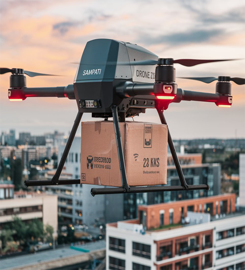 The Sampati drone is a cutting-edge solution designed to revolutionize delivery times for small packages. With its sleek design and efficient operation, it ensures packages weighing up to 2.3 kg are delivered in under 30 minutes.